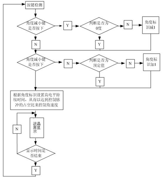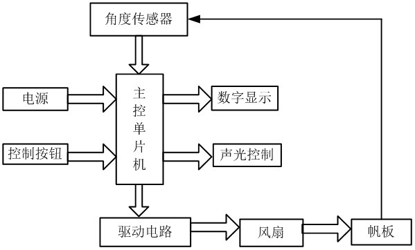当用手控制帆板时,显示屏能够实时显示帆板的转角,可显示范围为0°~90°;当通过操作键盘给单片机传送加速指令,风扇速度由零逐渐增大到最大风速,帆板与竖直面的偏转角度相应的由0°增大到60°,显示屏也实时显示倾角度数;当需要帆板偏转到某个固定角度时,通过键盘输入角度值,单片机通过分析控制风扇转速,使帆板的偏转角度逐渐达到设定值,并实时对帆板角度进行修正,当帆板转动接近预定的角度(±3°)时会发出声光提示。