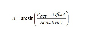 其中,VOUT为倾角传感器输出脚模拟电压,offset是设备在0g位置时的电压输出(一般输出值为2.5v),Sensitivity是设备的灵敏度(通常灵敏度为2v/g)。为得到最准确的精确度,应当用实际输出值代替通常值。