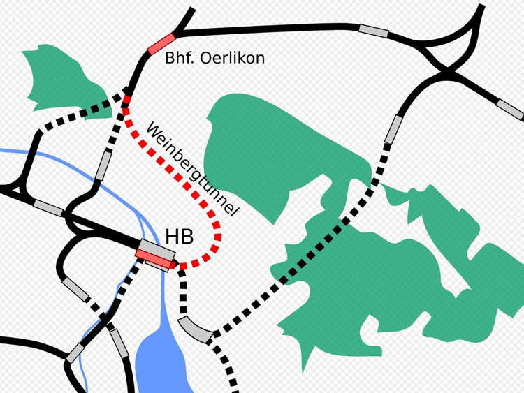 苏黎世位于中欧的核心位置,其铁路和公路枢纽联系了德国、法国、奥地利和意大利四个国家。苏黎世一带属于低山丘陵,地质结构复杂,铁路和公路常需要经穿越山脊的隧道相连。在苏黎世北部,有一个重要的铁路枢纽Oerlikon,北通德国巴伐利亚地区。此枢纽南部有三条铁路隧道连接苏黎世中心地区:最老的Wipkingen隧道完工于1856年,Kaferberg隧道完成于1969年,最新的Weinberg隧道2015通车,连接了Oerlikon和苏黎世最大的客运站Hauptbahnhof(HB),其长度近5公里,深度较深,一路行经若干其他隧道(如Hirschengraben铁路隧道、 Letten铁路隧道、Milchbuck公路隧道等)的下方。