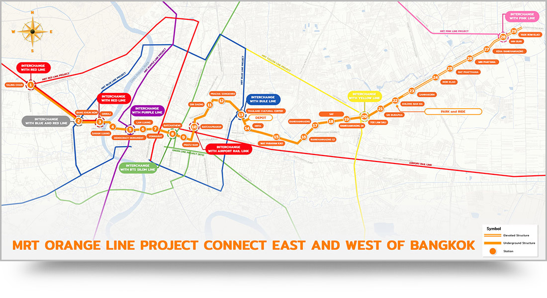 地铁橙线(MTR Orange Line)是曼谷公共交通系统的重要扩展,目前施工中的东段旨在连接市中心与东部地区并缓解交通拥堵,计划于2028年通车。此段地铁线路包括双线直径6.3米的隧道、多个地下车站、通风井和明挖回填隧道。该线路贯穿曼谷最繁忙的道路,地质结构复杂,其中一个车站位于立交桥下方,另有几条运河交叉口需要临时或永久改道。