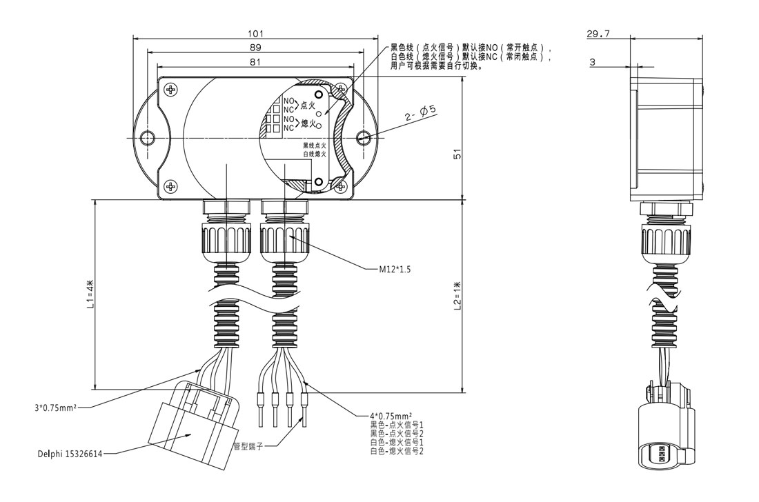 SQ-S01-A1 是直川科技为客户定制的点熄火控制盒。控制盒将操控盒输出的单线有源(24V)点熄火信号,转换成双线干接点形式,且可以灵活配置干接点类型。