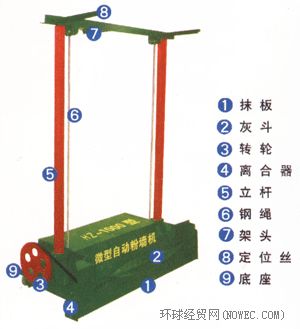 自动粉墙机,它主要包括由前固定立柱、前调节立柱、后固定立柱、后调节立柱、主机架、空心顶柱、压杆等组成升降机架,由电动机、调速器、绳轮、链条、钢丝绳等构成传动装置,由沙浆托架、送灰板、抹灰板、偏心轮、蜗杆、齿轮、齿条等构成粉墙装置,该自动粉墙机结构简单、操作方便实用,以机代人大大的降低运动强度,省时省力、节约粉灰,适用于建筑行业粉墙作业。