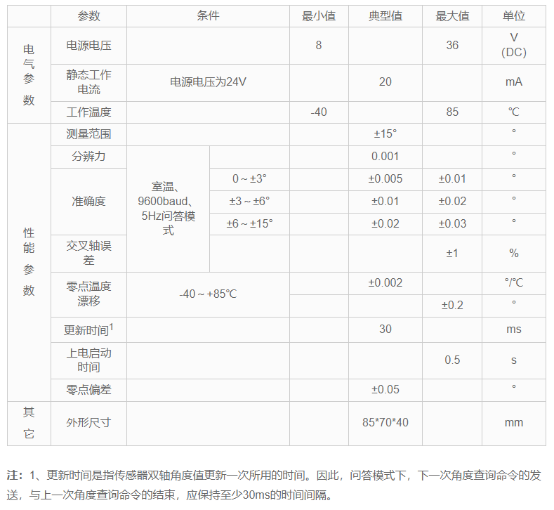 产品量程±15°,采用铝合金外壳,防护等级IP67。精度可达0.001°