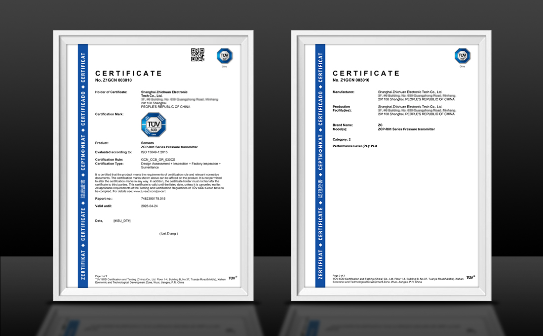 功能安全认证,具备更高的技术门槛,国内压力传感器厂家获得此认证者几乎空白。直川科技自2022年1月开始,投入研发力量,用一年时间取得了3张TüV SüD颁发的PL认证证书。此次压力传感器证书的获得,项目用时3个月。
