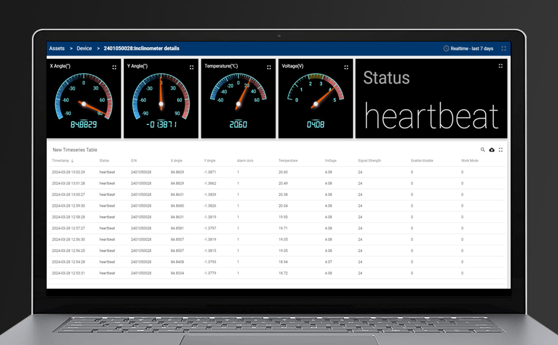 直川公司的NB-IoT无线倾角仪是一种更简便、高效的无线倾斜监测方案。插上资费便宜的NB-IoT SIM卡,每一台NB-IoT倾角仪都是一个独自发送数据的节点。只要当地有稳定的蜂窝无线信号,NB-IoT倾角仪就可以通过基站接入互联网,然后把数据发送到监测公司的服务器或者第三方平台。