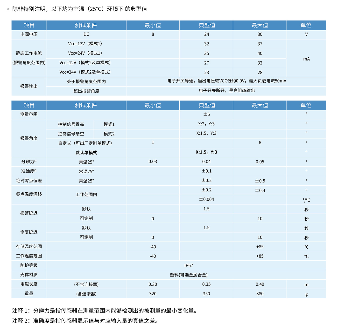 ZCT206LX-SQS-A1G-4007C 产品是直川科技研发的新一代高性价比双轴倾角开关,该系列产品采用高性能微处理器为核心,对传感器的零点偏差、灵敏度偏差进行校正,从而确保产品的可靠性和一致性;报警角度包括双载荷模式和自定义模式,方便客户选择;传感器自带水泡,通过观察水泡位置以及按键置零设置传感器当前零点,使之符合现场需求,方便客户使用。